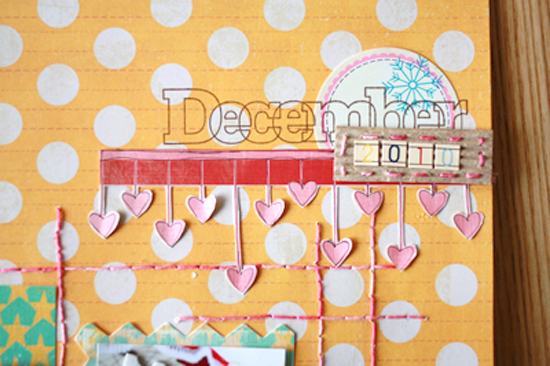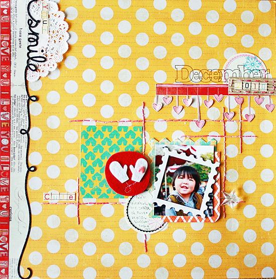 [12インチレイアウト「your smile」] まず目についた印象的な黄色のドット。 これを最大限に使いたくてベースにしてみました。 ピンクの糸をバックステッチしてグリッド模様を作っています。 ペーパーに貼ってから形どおりにカットしたステッカーをタイトルにしました。 レースペーパーは少し飾っただけで、とても華やかになるアイテムで使いやすかったです。