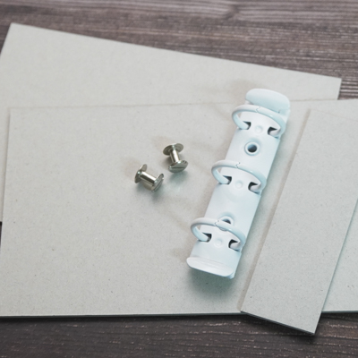 プレカットの厚紙―(表紙用縦4インチ×横6.25インチ2枚・背用縦4インチ×横1.25インチ1枚)金具‐穴間隔約3cm(1-1/8 インチ)、長さ約9cm(3.5インチ)。金具の高さ約24mm。ビス2組。
