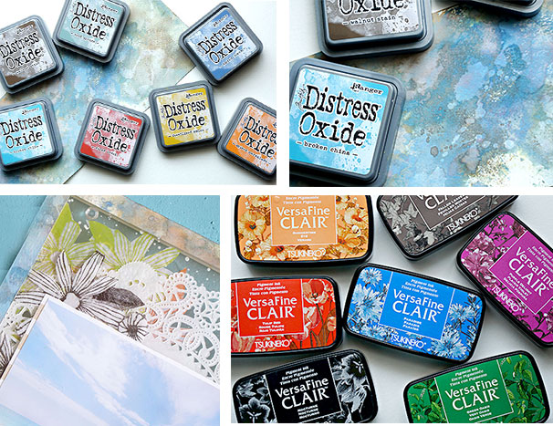 発色が綺麗なツキネコの新作インク・バーサファインクレアと、独特な色味と色の乗りが素敵なRangerの新作インク・Distress Oxide Inkなどを着色アイテムとして使用しています(^^)