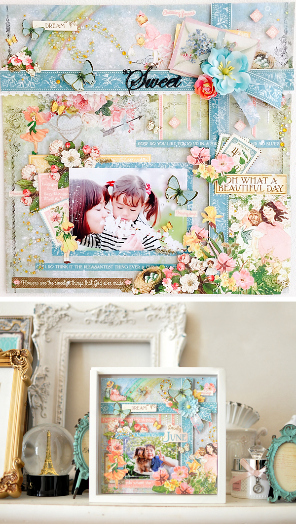 レイアウト全体にリボンをかけた華やかなデザインに、g45ならではの柄を組み合わせてストーリーを作り、PrimaのMica Powder 、Glass Glitter、ちょっと懐かしいラインストーン、そして水彩色鉛筆を使ってさらにファンタジーな作品に仕上げていきます。