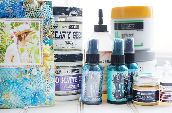 ジェッソ・アクリル絵の具・ミスト・モデリングペースト・スカルプチュアメディウム・質感を加える様々なアイテム、、、時間いっぱいたっぷりとミクストメディアなキャンバス作りをお楽しみください☆