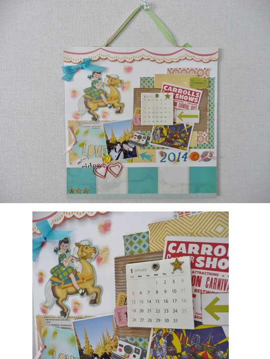 リビングの目に付くところに常に飾っておけるように壁掛け式にしました。 年頃の子たちなので写真は小さめにして、うま年にちなみメリーゴーランドをポイントにしました。下の縦ボーダー部分はポケットになっています。