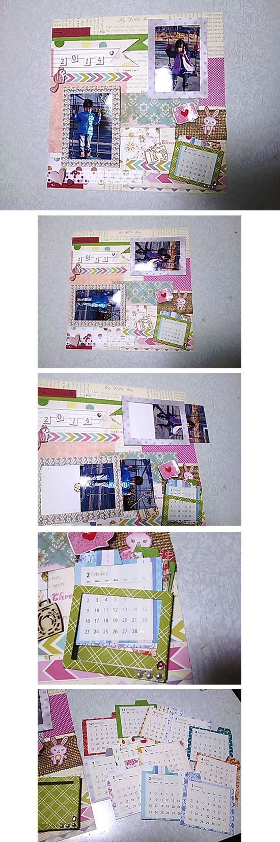 カレンダーということで、 カレンダー部分、写真部分を入れ換えられるようにしてみました。 写真は縦横に対応するため、可動式になっています。 カレンダーは、毎月台紙の色を変え、季節感を出しました。