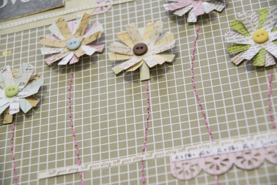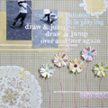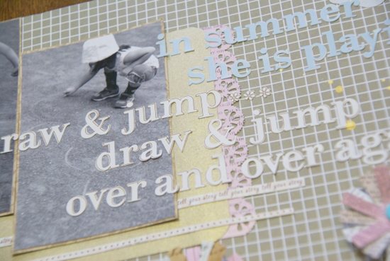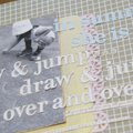 [12インチレイアウト「over and over again」] ゴールドが持つノスタルジックな感じと涼やかなイメージを大切に作ってみました。 こうゆう渋い色味に子供の写真を合わせるのは大好きです。 淡いブルーやピンクで涼やかさをUP。フラワーの茎はピンクの刺繍糸でステッチを。 キットにアルファベットがたっぷり入っているので、少し長めの文を入れるのもいいですよね。 最後にゴールドの絵の具をポタポタと。
