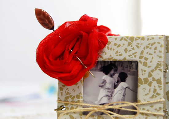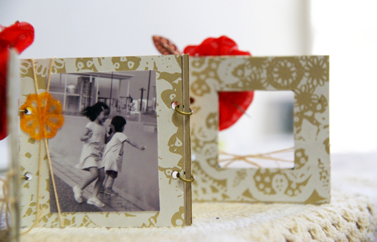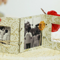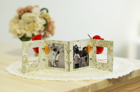 [アコーディオンブック2.5×2.5インチ] フレームチップボードが手のひらサイズでとてもかわいらしかったので、表紙と裏表紙に使って アコーディオンブックを。他のチップボードも同じ大きさに切り、丸カンでつなげてみました。 閉じて飾っても、もちろん開いて飾っても、そして片方だけ閉じたり・・・アンティーク雑貨のような1冊ができました。 ゴールドに赤の組み合わせもとっても大人っぽいです。