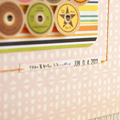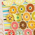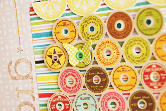 [12インチレイアウト「Grow」] 糸巻き柄を楽しく使えないかな、と試行錯誤してみました。ハサミやカッターを使ってコツコツと切り抜いたいくつかの糸巻きをポップアップさせています。ワンポイントで蝶々を飛ばしてみましたよ。右下には日付けのスタンプを。文字もスタンプ自体も少しレトロな感じでかわいいです。写真や飾りを台紙の中心に集中させて仕上げはミシンでグルリと。かわいい色味でキュートな1枚が完成したかな、と思います。