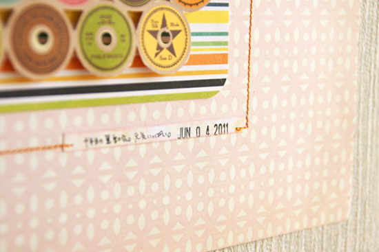 糸巻き柄を楽しく使えないかな、と試行錯誤してみました。ハサミやカッターを使ってコツコツと切り抜いたいくつかの糸巻きをポップアップさせています。ワンポイントで蝶々を飛ばしてみましたよ。右下には日付けのスタンプを。文字もスタンプ自体も少しレトロな感じでかわいいです。写真や飾りを台紙の中心に集中させて仕上げはミシンでグルリと。かわいい色味でキュートな1枚が完成したかな、と思います。