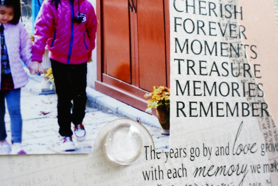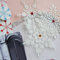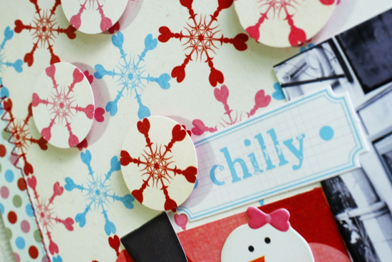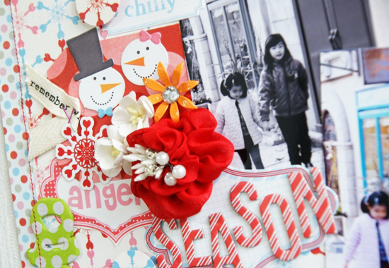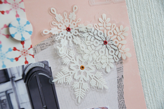 ベビーピンクの優しいイメージで作ってみました。雪の結晶は中心をアイレットで留めています。「Photo」のチップボードは水玉のティッシュペーパーで包んでみました。ティッシュペーパーはやわらかいのでいろんな用途に使えますよね。結晶柄のペーパーはところどころポップアップさせています。ふんわりした雰囲気の中に黒のかっこいいラブオンが入るとなんだか少しピリッとして全体が引き締まるような気がします。