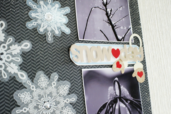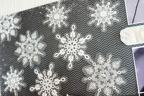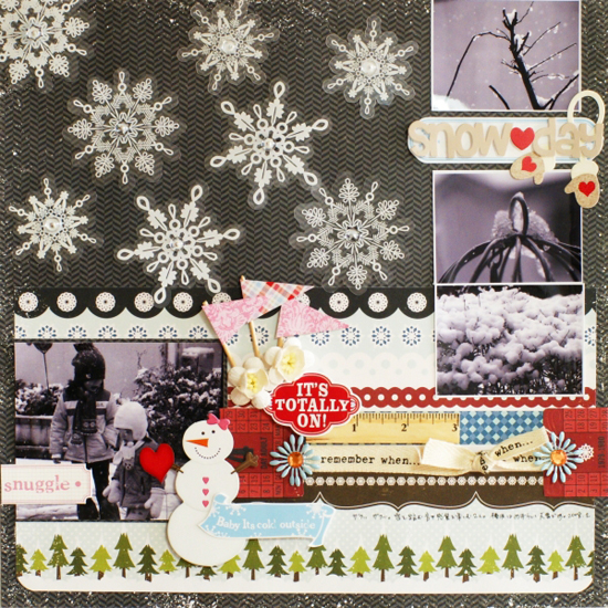 [12インチレイアウト「snow day」] 雪の結晶を贅沢に黒の台紙に散りばめてみました。全体的な色味は少し落ち着いた雰囲気だけれど、雪の中で遊ぶ子供たちの写真に合うように、キュートな雪だるまや手袋のステッカーを添えました。ところどころポップアップさせて立体感を楽しんでいます。旗は爪楊枝を使って手作りしてみましたよ。冬のレイアウト、楽しんで作ってみて下さいね。