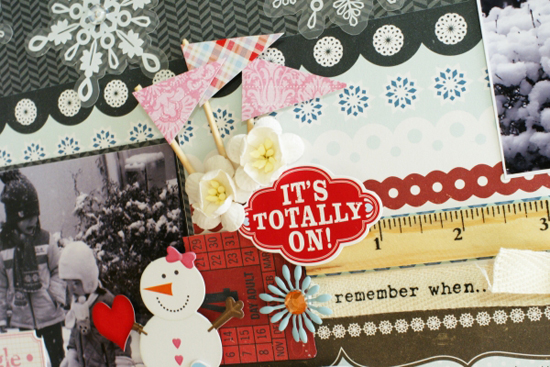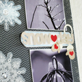 雪の結晶を贅沢に黒の台紙に散りばめてみました。全体的な色味は少し落ち着いた雰囲気だけれど、雪の中で遊ぶ子供たちの写真に合うように、キュートな雪だるまや手袋のステッカーを添えました。ところどころポップアップさせて立体感を楽しんでいます。旗は爪楊枝を使って手作りしてみましたよ。冬のレイアウト、楽しんで作ってみて下さいね。