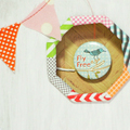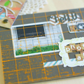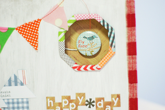 箱のフタ部分はまず糊を剥がして1枚ぺラッと。白のアクリルを塗って左右の辺にミシンで布を縫い付けました。バナーもミシンで。小鳥が覗く小窓はくり抜いています。小窓にはマスキングテープを巻きつけたフレームチップボードを付けてみました。お家などチョコッと飾りつけをして剥がした糊の部分を再度貼り付け。この時、布を付けた分、少しフタの入口が小さくなってしまっているので、糊しろを調節するとグッドです。そんな感じでフタ完成。