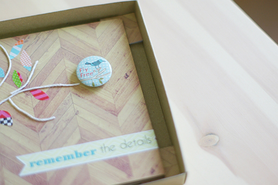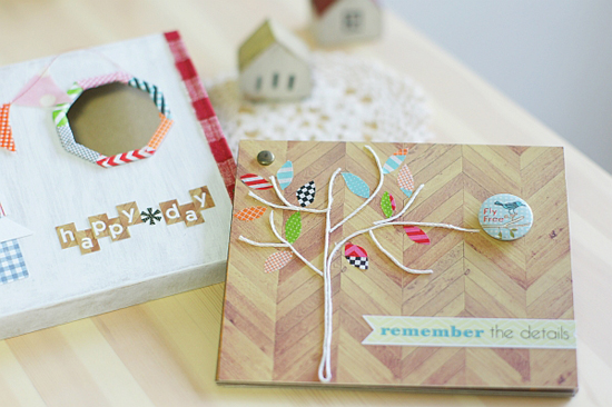 [album box] Scrapbagにはペーパーや飾りの他にも店長ayaさんが「これは使えそう!」とセレクトした楽しい材料が入っています。今回は「箱!」。「好きなように作ってみて下さい」とayaさんからの一言。なんの飾りもない箱を手にとりながら、「どんなの作ろう・・・私らしい箱を作りたいな・・・私だったらどんな箱が欲しいかしら・・・」と試行錯誤。そして出来上がったのがコレです(笑)。少しかわいらしくなり過ぎた感は否めませんが、シンプルなんだけど、ちょこっとかわいらしい・・・というコンセプトをもとに作ってみましたよ。 箱のフタ部分はまず糊を剥がして1枚ぺラッと。白のアクリルを塗って左右の辺にミシンで布を縫い付けました。バナーもミシンで。小鳥が覗く小窓はくり抜いています。小窓にはマスキングテープを巻きつけたフレームチップボードを付けてみました。お家などチョコッと飾りつけをして剥がした糊の部分を再度貼り付け。この時、布を付けた分、少しフタの入口が小さくなってしまっているので、糊しろを調節するとグッドです。そんな感じでフタ完成。 中のフォトアルバムは一つ穴をブラッズで留めたスライド式にしてみました。表紙にはまず小窓から覗く小鳥を。木の枝にとまっているように紐を貼り付け木にみたててみました。葉っぱはマスキングテープを。マスキングテープ、最近はたくさんの柄が出ているけれど、いろいろな使い方ができて楽しいですよね。 中のフォトアルバムは箱に入れたとき位置が固定していないと小窓から小鳥がきちんと見えないので、コーナーを作って箱の中で位置が固定するようにしてみました。 みなさんも自分らしい「箱」、是非完成させてみて下さいね。