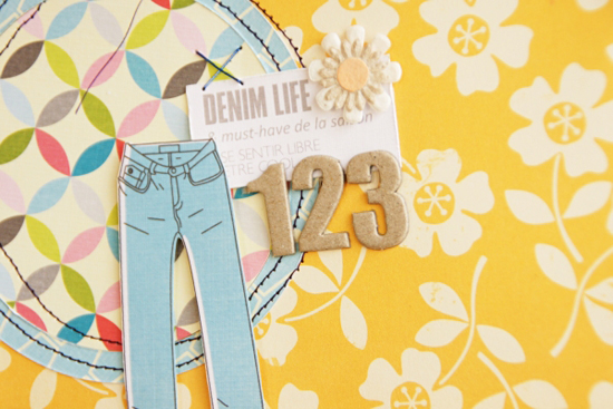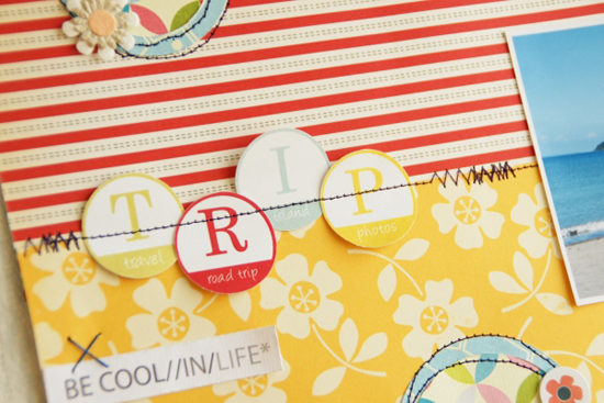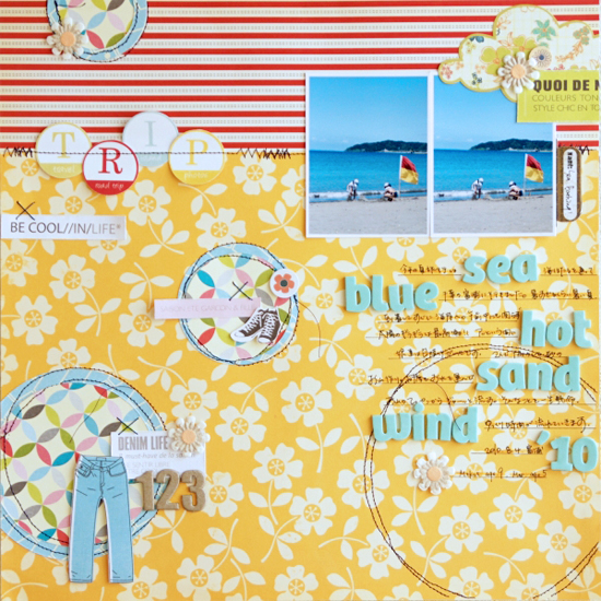 [12インチレイアウト「 TRIP」] 写真の中の旗の色とリンクさせて、赤と黄で元気にパキッと作ってみました。 今回キットの中にはたくさんのアルファベット。タイトルにはshabby chicのカラフルなサークルアルファベットを、ACのステッカーはジャーナルのところどころにキーワードみたいに入れてみました。アルファベットの楽しい使い方、いろいろ試してみてはいかがでしょうか。