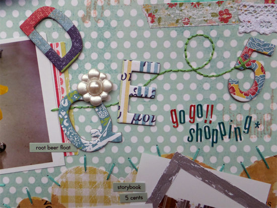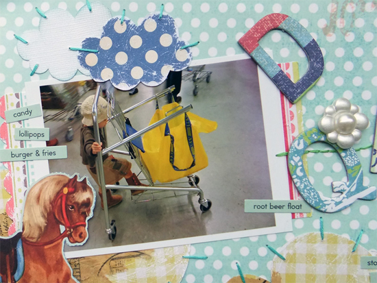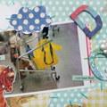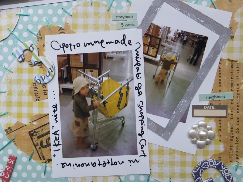 [12インチレイアウト「go go! shopping」] IKEAでお買い物中、以前はカートに乗っていた娘がいつの間にか押す側になって… かわいくてついつい撮ってしまった写真で作りました。 今回のScrapBagは「かわいい」ペーパーばかりだったので、 おもちゃ箱をひっくり返した様なかわいくて楽しいレイアウトを作りたいと思いました。 カラフルなチップボードアルファベットはタイトルに使うには少し大きいかな?と感じたので、 散らしてエンベリとして使いました。(この使い方なら残ったアルファベットも使いきる事ができます。) 黄色のギンガムのペーパーは、そのまんま使うよりも少し茶色を足した方がいいと思い、 インクで汚そうかと思いましが、7Gypsiesのティッシュペーパーを入れてみたらピッタリ!でした。 渋くなりすぎない様に周りを刺繍糸で大きめにステッチをしてみました。 October Afternoonの昔懐かしい切り絵絵本のようなペーパーは、やっぱり切って使うのが一番かわいい!ので、 とりあえずほとんど先に切ってしまって、あとからどれを使おうかな…と選んでみました。 あとは少し寂しいかな?と思うところにステッカーをペタペタ貼って完成させました。