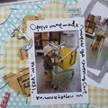 今回のScrapBagは「かわいい」ペーパーばかりだったので、 おもちゃ箱をひっくり返した様なかわいくて楽しいレイアウトを作りたいと思いました。 カラフルなチップボードアルファベットはタイトルに使うには少し大きいかな?と感じたので、 散らしてエンベリとして使いました。(この使い方なら残ったアルファベットも使いきる事ができます。) 黄色のギンガムのペーパーは、そのまんま使うよりも少し茶色を足した方がいいと思い、 インクで汚そうかと思いましが、7Gypsiesのティッシュペーパーを入れてみたらピッタリ!でした。 渋くなりすぎない様に周りを刺繍糸で大きめにステッチをしてみました。 October Afternoonの昔懐かしい切り絵絵本のようなペーパーは、やっぱり切って使うのが一番かわいい!ので、 とりあえずほとんど先に切ってしまって、あとからどれを使おうかな…と選んでみました。 あとは少し寂しいかな?と思うところにステッカーをペタペタ貼って完成させました。