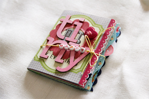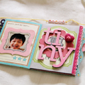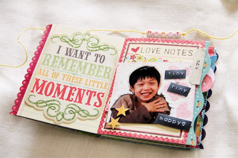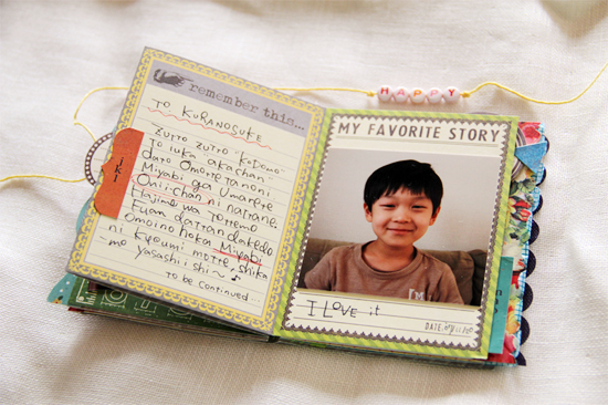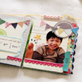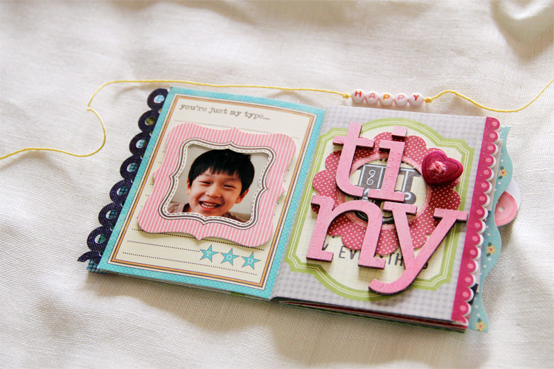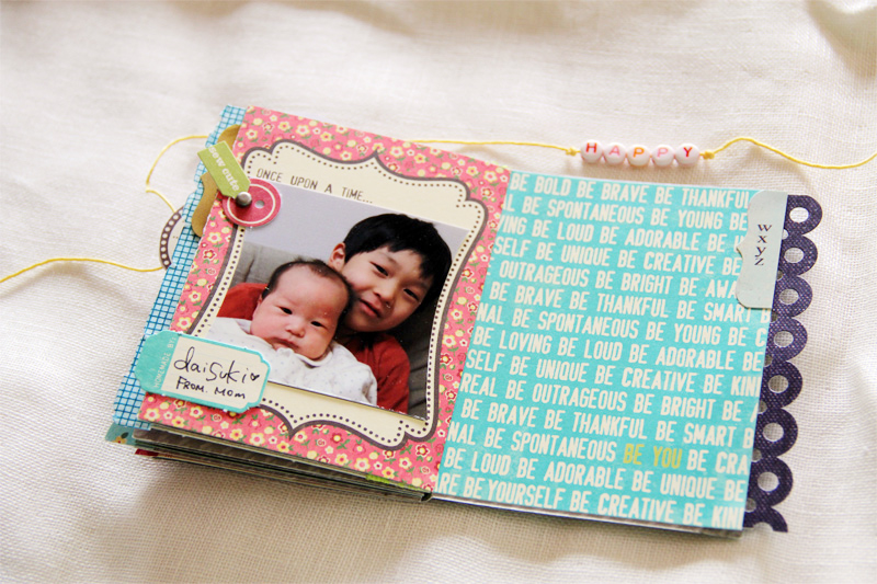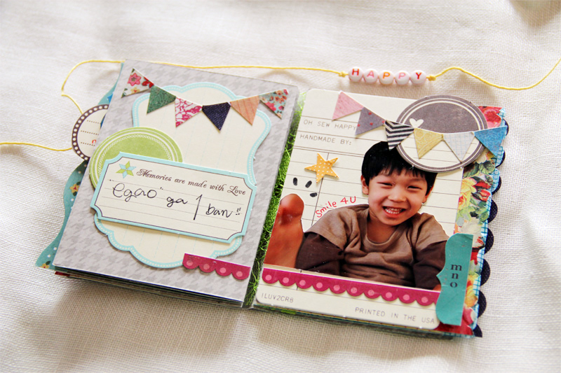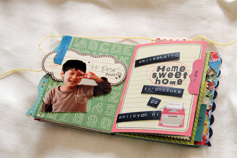 [ ミニブック「tiny HAPPY」] 4年前の、娘が生まれて兄となった小さかった息子の写真で作ったミニアルバムです。 まだまだ小さかった彼がちょっと成長したかな?という思いを小さなアルバムに込めました。 元々ミニカードがたくさん入ったPPだったので、これをそのまま活かしてどうにかして簡単な ミニアルバムにできないかな?と思い、はじめは2枚ずつくっつけたまま1ページにして… 横長の形で、写真を半分コメントを半分…という形式を考えました。 でも作って行くうちに始めから半分の形の方がかわいいと思い、スターブックをイメージして 貼り合わせました。たたんでいくうちになんとなく簡易ブックの様になったので、そのまま採用。 4×6インチのペーパーを6枚貼り合わせ、折っただけのものです。 (最初に切らなければ、4×12インチを3枚貼り合わせ折っただけでもできます。) ダイカットペーパーや縁にはステッカーを使い、特別な加工をしなくても貼るだけでちょっと凝ったような ミニアルバムが完成します。そのままだと開いてしまうのでヒモで結ぶタイプにしましたが、 細めのゴムを使えばもっと楽に閉じることができると思います。 写真は人型に切り抜いたり、ペーパーに入っている枠に合わせて切ったりすると、 絵本の様なかわいいイメージになると思います。