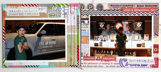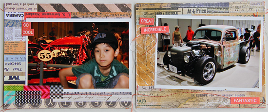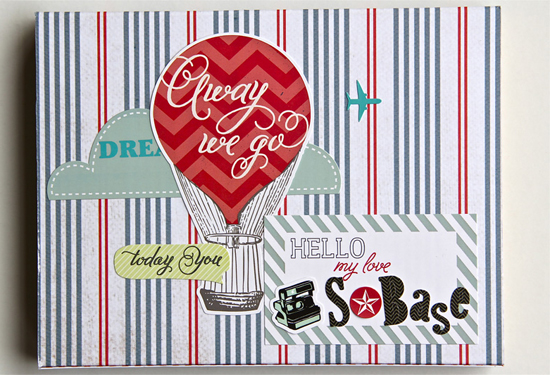 [ミニブック「S☆Base」] 2012.8.のバイマンスリーキットにはマッチ箱のような形状の箱が入っています。 これは中に写真を入れておいたり、ミニアルバムを入れてたり、材料を入れておく…等、 アイディア次第でいろんなことに使えそうなものです。 私はこの中にミニアルバムの様に綴じてないタイプのカードの様なミニアルバムを入れました。 今回このアルバムに使ったのは先日行われていた「自動車ショー」の写真。 ボーイッシュなイメージ、空を飛んでいる様なワクワク感を出すために雲と気球のステッカー、 飛行機を飛ばして雰囲気を出し、タイトルを付けただけ…のシンプルな表紙にしました。 中を開けると、それぞれ独立したカードの様な写真入り年賀状の様な形状のものを4枚の厚紙の裏表計8枚作りました。 見たい人がそれぞれ見たいスタイルで順番不同で見られる様なものを作りました。 ページが決まっていないので、今後増やそうと思えばいつでも増やせます。 1枚1枚独立して順番も決まってないのですがやはり統一感は持たせないとひとつの作品にはならないので、 今回はペーパーテープをいろんな場所に付けたり、ミシンの糸を同じ色にして作りました。 箱形のおかげで綴じる作業の無い簡単なページもバラバラになることなくまとめる事ができて 面白いアルバムができました。