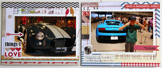 今回このアルバムに使ったのは先日行われていた「自動車ショー」の写真。 ボーイッシュなイメージ、空を飛んでいる様なワクワク感を出すために雲と気球のステッカー、 飛行機を飛ばして雰囲気を出し、タイトルを付けただけ…のシンプルな表紙にしました。