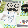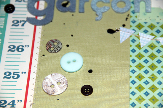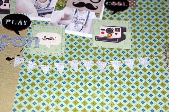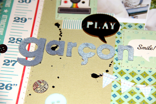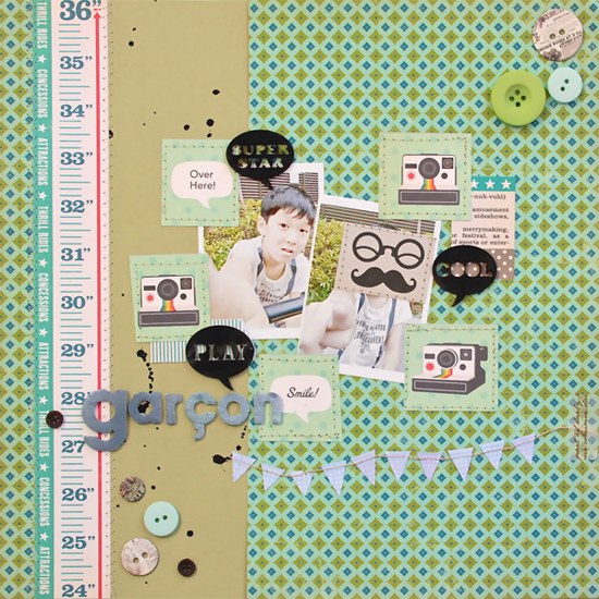 [12インチレイアウト「garçon」] レイアウトを作り終わった後で、タイトル何にしよう???と迷ったあげく、 Boy??…でも3文字は短過ぎる…だったらフランス語にしようと garçonにしたものの、フランス語なので本当はleとか付けるべきだったのかも。 Woodの吹き出しは黒で塗ってOctober Afternoonのwash tape風にしました。 カードストックには黒のアクリルを全体に飛ばしました。 使えそうな場所を探して、上からペーパーを1インチ+7インチ重ねました。 ポラロイドの絵が可愛かったので、息子の写真の周りをぐるりと囲む様に付けました。 そのままなのも味気なかったので、ミシンでひと手間かけました。 今回写真の上に眼鏡のおじさん顔柄のペーパーを貼ってしまった写真。 実は…レンズを指差している体の方は良くても、目をつぶってしまってボツになった写真。 こういうのを使えないかと思っていたの、思い切って貼ってみてよかったです。 ロボットみたいな、おもちゃみたいな、コケティッシュな感じに満足しています。 物差し柄は成長をイメージして。最後にボタンを付けて立体感も少し出しました。