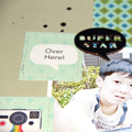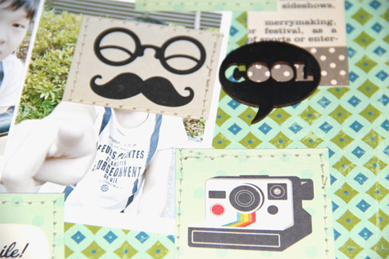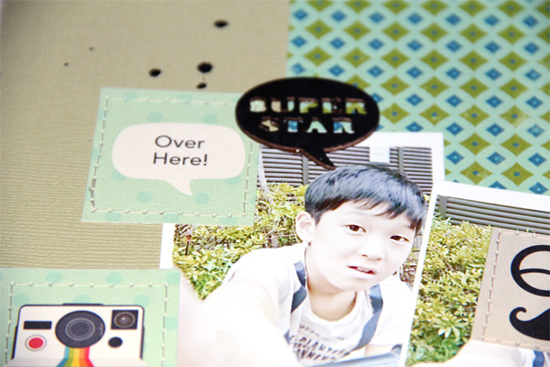 レイアウトを作り終わった後で、タイトル何にしよう???と迷ったあげく、 Boy??…でも3文字は短過ぎる…だったらフランス語にしようと garçonにしたものの、フランス語なので本当はleとか付けるべきだったのかも。 Woodの吹き出しは黒で塗ってOctober Afternoonのwash tape風にしました。 カードストックには黒のアクリルを全体に飛ばしました。 使えそうな場所を探して、上からペーパーを1インチ+7インチ重ねました。 ポラロイドの絵が可愛かったので、息子の写真の周りをぐるりと囲む様に付けました。 そのままなのも味気なかったので、ミシンでひと手間かけました。 今回写真の上に眼鏡のおじさん顔柄のペーパーを貼ってしまった写真。 実は…レンズを指差している体の方は良くても、目をつぶってしまってボツになった写真。