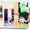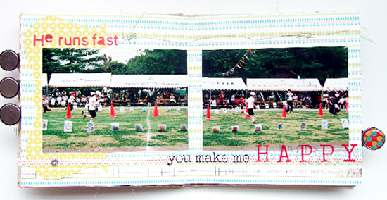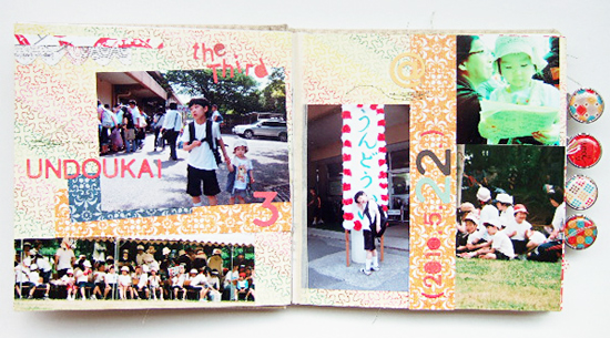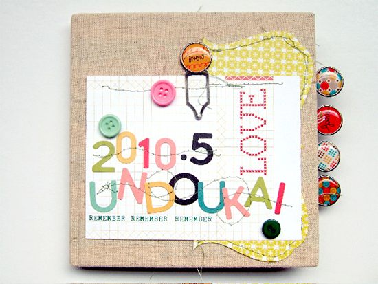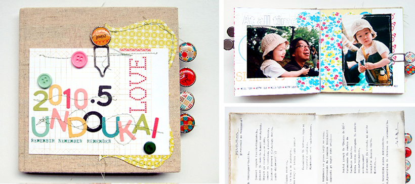[オルタードブック「2010.5 UNDOUKAI」 サイズ6インチ] 古本屋で購入した「おにぎりの本(レシピ本)」を、オルタードブックにしてみました。 今回のScrap Bagは、多くのアルファベットやクリップやラブオンなどが入っているので、各ページに連続して使うことで共通性を持たせることがで きます。Casket*オリジナルプリントペーパーは、運動会の爽やかな感じにとてもマッチして使いやすかったです。(このペーパーだけで一冊作ってみたかったとも思いました。)また、他社のペーパーとの相性もすごくよかったです。 BGのtrimsにはかっこよく「数字」が入っているため、徒競走など運動会写真にもピッタリです。このScrap Bagを使って「運動会の思い出作り」...オススメです♪