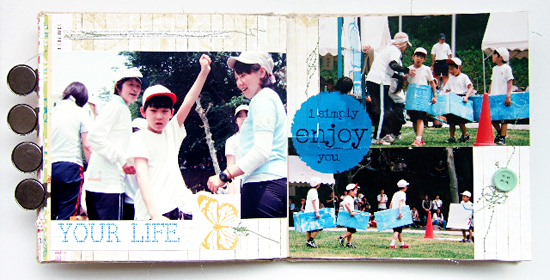今回のScrap Bagは、多くのアルファベットやクリップやラブオンなどが入っているので、各ページに連続して使うことで共通性を持たせることがで きます。Casket*オリジナルプリントペーパーは、運動会の爽やかな感じにとてもマッチして使いやすかったです。(このペーパーだけで一冊作ってみたかったとも思いました。)また、他社のペーパーとの相性もすごくよかったです。 BGのtrimsにはかっこよく「数字」が入っているため、徒競走など運動会写真にもピッタリです。このScrap Bagを使って「運動会の思い出作り」...オススメです♪