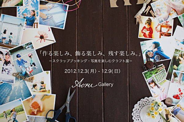今回の展示では、スクラップブッキングで一般的な12インチサイズのページレイアウトや、形にこだわらずそれぞれの大切な思いのこもった写真で作った9名のクラフト作品(写真雑貨・ミニブック等)を展示します。
