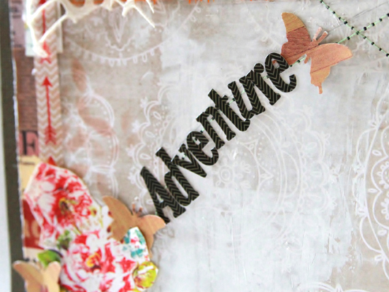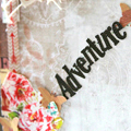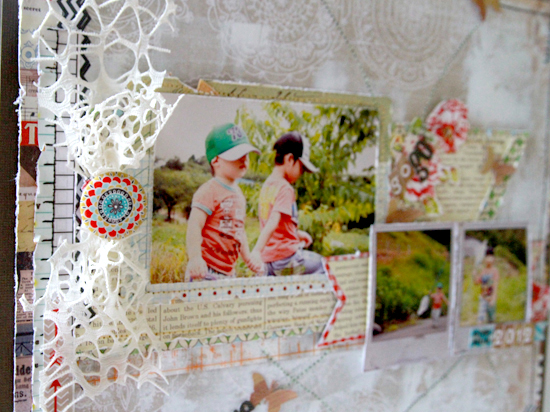 [12インチレイアウト「Adventure」] 虫取りの写真を渋い色合いで作りました。 台紙にはGESSOを塗っています。渋いなかにもすこし花をパターンペーパーから 切り出して貼り、赤のさし色を入れました。 Echo Park Paper のアルファベットステッカーの黒の字体は、ちょうどいい大きさと色合いでとても使いやすかったです。