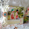 虫取りの写真を渋い色合いで作りました。 台紙にはGESSOを塗っています。渋いなかにもすこし花をパターンペーパーから 切り出して貼り、赤のさし色を入れました。 Echo Park Paper のアルファベットステッカーの黒の字体は、ちょうどいい大きさと色合いでとても使いやすかったです。