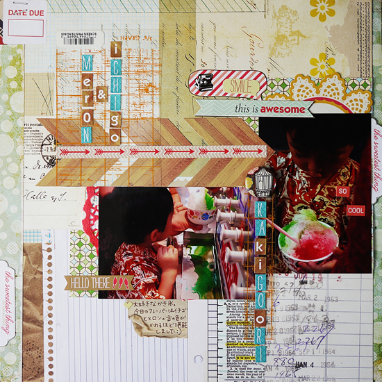 [12インチレイアウト「kakigoori]BasicGreyのコラージュされた模様のペーパーを活かしたレイアウトです。このまま写真を置いてもいいようなデザイン性のあるペーパーだったので、ペーパーを重ねすぎないようにしました。 EchoParkの木目は矢印型にカットし上からEchoparkのボーダーステッカーを重ねて、メイン写真に目が行くようにしました。メイン写真が縦なので、タイトルも縦にしてみました。 かき氷のシロップの緑をなじませるように、Jillibeansoupの緑のペーパーも取り入れました。二つの色のアルファベットを混ぜたので、一列でもメリハリが出るようになったと思います。 夏祭りは夜の撮影のことも多いかと思います。写真は屋台や街頭の光が当たるところで撮影したり、暗いままの写真もトランスパレンシーを用いて透明感を足したりしながら作成すると、夏の夜の思い出の写真もレイアウトにしやすいかと思います。