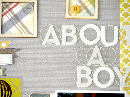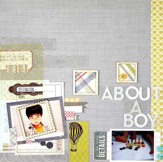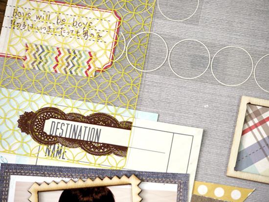 [12インチレイアウト「best memory」] 男の子のイメージでグレー、イエロー、ネイビーを主に使いました。 スクエアとサークルを混合でレイアウト内で入れることで男の子のさまざまな心模様をあらわしたつもりです。 メイン写真のほうが明るいので最初に目に行くようになったのではないかと思います。 タイトルに使ったAmerican Craftsのステッカーは、粘着性を利用しパターンペーパーとトランスパレンシーで挟みました。 タイトルの「O」と「T」はアクセントのために剥離紙をはがさずに使用しています。 ジャーナルはトランスパレンシーの下に配置しました。