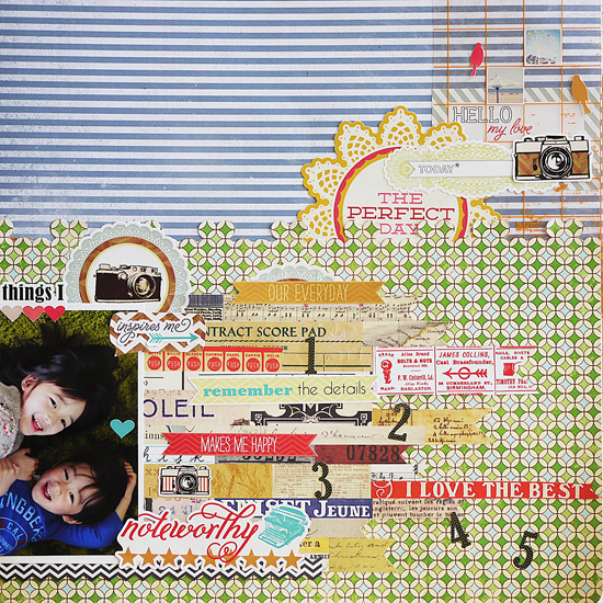 [12インチレイアウト「THE PERFECT DAY」]横の流れが楽しい元気なレイアウトを作りたかったので、Glitzのボーダーのペーパーをランダムな長さでカットしました。上にEchoparkのステッカーを重ねて、渋さにかわいさをプラスしました。 台紙のJillibeansoupの緑のペーパーは柄を活かしてカットし、ILSのブルーのボーダーのペーパーと合わせて台紙にしました。 MyMind'sEyeのダイカットは覗かせるように配置し、太陽のようにさわやかなイメージで置きました。 Hamblyのトランスパレンシーのマス目とEchoParkのスクエアのステッカーの大きさが同じだったので、トランスパレンシーの上に貼りアクセントにしています。トランスパレンシーの特性を活かしペーパーやステッカーを下にも上にも配置しています。