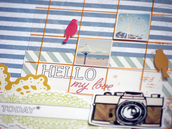 Hamblyのトランスパレンシーのマス目とEchoParkのスクエアのステッカーの大きさが同じだったので、トランスパレンシーの上に貼りアクセントにしています。トランスパレンシーの特性を活かしペーパーやステッカーを下にも上にも配置しています。