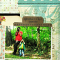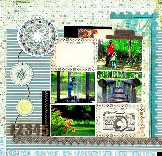 [12インチレイアウト「12345」] 数字のチップボードをそのままタイトルにし、数をかぞえながら遊んでいる時の写真を使って作りました。 数えながら踏み出す一歩一歩が不安定だったので、ステッカーを足跡に見立てて不安定な感じをステッチもまぜて表現しています。 BGのタブは片面に粘着スポンジがついているのでそのままLOに貼るとポップアップしたタブのようにみえます。この粘着スポンジ、こすればきれいにスルッと剥がれますので、ミニブックの側面に挟んで本来のタブとして使ってもいいと思います。 一つ一つ違ったデザインなので、選んだタブによってLOの雰囲気も変わり、おもしろいアイテムでした。