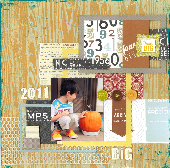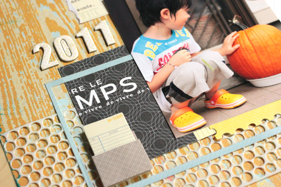 12インチレイアウト[BIG] 今年のハロウィンのカボチャができあがり、そのカボチャを嬉しそうになでている息子の写真で作りました。 フレームの形のシールを重ね合わせたり、ポップアップして立体感をだしてみたりして作っています。 ベースに使った台紙は、とてもしっかりしていてボコボコしているペーパーだったので、アクリル絵の具を塗ったのですが、とても味のあるかすれ具合に仕上がりました♪
