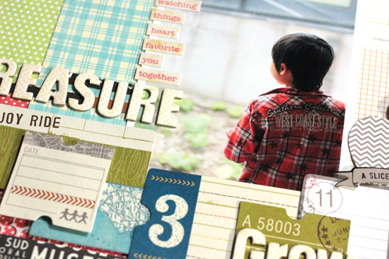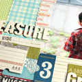 12インチレイアウト[TREASURE] 額のようにカットしたペーパーはポップアップして立体感を出しています。そして、その額の上にさらに重なるようにダイカットをランダムに重ね合わせてみました。このダイカットも、そのまま貼った部分もあればポップアップしている部分もあります。ポップアップすることで可愛らしさが増すのでお好みでやってみてもいいと思います♪ボタンはカラー麻紐を穴に通してアクセントにしてみました。