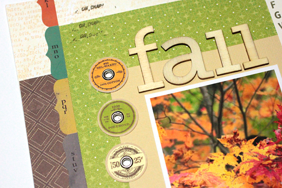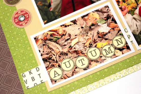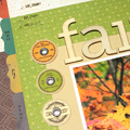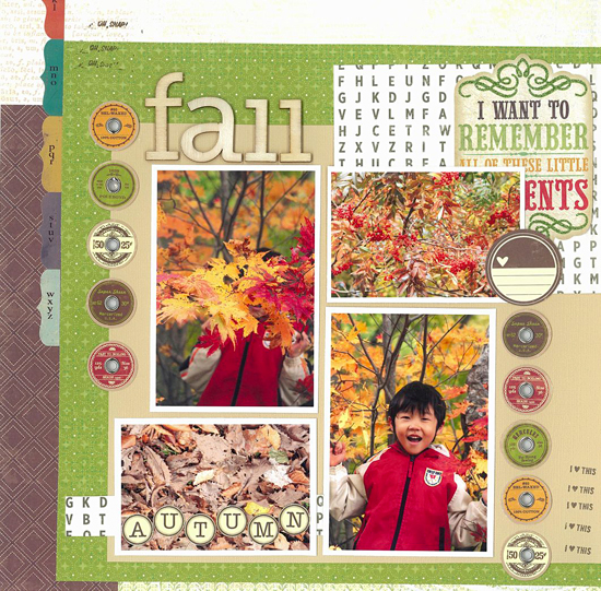12インチレイアウト[Fall] 紅葉狩りに行ったときの写真を使って作りました。ペーパーをサークルパンチでカットアウトし、はとめで留めています。はとめで留めることでかっこよさが増すのでカッコいいレイアウトを作りたい男の子ママにはお勧めです。 サブタイトルのautumnは落ち葉の写真に直接貼ってみました。