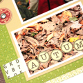 紅葉狩りに行ったときの写真を使って作りました。ペーパーをサークルパンチでカットアウトし、はとめで留めています。はとめで留めることでかっこよさが増すのでカッコいいレイアウトを作りたい男の子ママにはお勧めです。 サブタイトルのautumnは落ち葉の写真に直接貼ってみました。