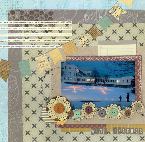 12インチレイアウト[With teacher] 幼稚園に実習に来ていた学生さん達が作ってくれた雪明かり。絆という字の前で先生と一緒にうつっていた写真がとても意味のあるものに感じたのでこの写真で作ってみました。写真の下にはランダムにフラワーを重ねつつ花びらを曲げて立体感を出しています。左上に押したスタンプはドットのかすれ具合が絶妙にデザインされているスタンプでペーパーになじみやすいデザインのスタンプでした、物足りない部分のちょっと使いに重宝すると思います。