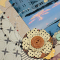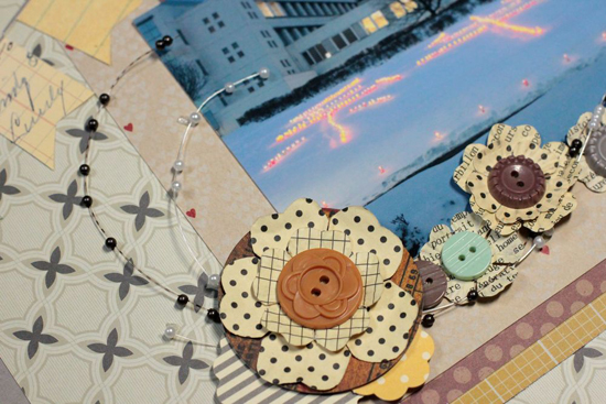 幼稚園に実習に来ていた学生さん達が作ってくれた雪明かり。絆という字の前で先生と一緒にうつっていた写真がとても意味のあるものに感じたのでこの写真で作ってみました。写真の下にはランダムにフラワーを重ねつつ花びらを曲げて立体感を出しています。左上に押したスタンプはドットのかすれ具合が絶妙にデザインされているスタンプでペーパーになじみやすいデザインのスタンプでした、物足りない部分のちょっと使いに重宝すると思います。