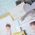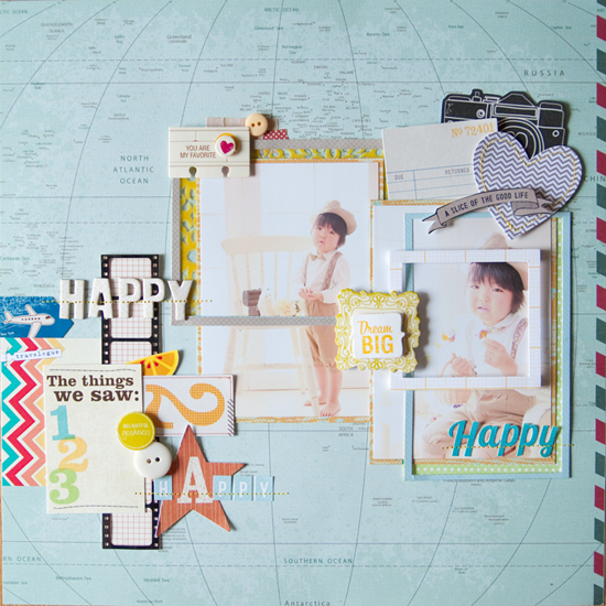 [12インチレイアウト「HappyHappyHappy」] カメラモチーフをテーマに、スタジオで撮った明るい写真を使用しました。 EchoParkのアルファベットに付属している大きめのフレームステッカーを使用して、スクエアを重ねるようなレイアウトに仕上げました。 スクエアの幅を変えたりポップアップして奥行きを出し、AmyTangerineのダイカットも重ねてボリュームを出しました。ハートのダイカットと、タイトルの上はミシンで強調させています。 トラベルがテーマのダイカットですが、特にトラベルものでなくても十分使えるアイテムでした。