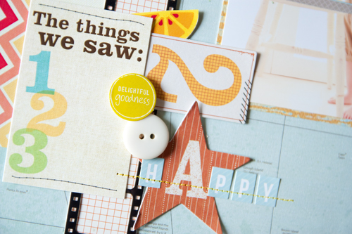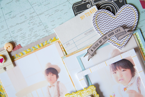 スクエアの幅を変えたりポップアップして奥行きを出し、AmyTangerineのダイカットも重ねてボリュームを出しました。ハートのダイカットと、タイトルの上はミシンで強調させています。