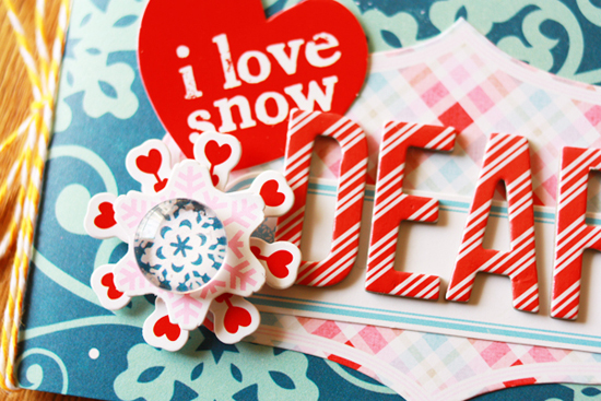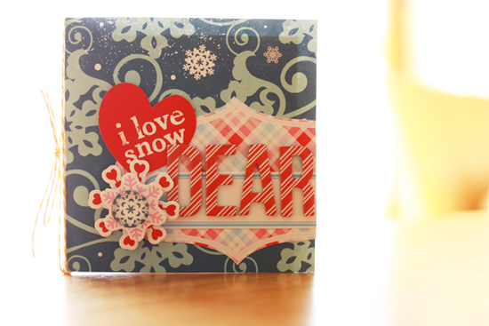 [カード「DEAR」 ] 正面から見たサイズは4インチの正方形になります。 4×8インチのペーパーと3.75×7.75のペーパーを2枚重ねて、Twineでまとめてしまうだけでお手軽なカードが出来ます。 特に糊付けはせず穴もあけなくて大丈夫です。 中身はトランスパレンシーやパンチで抜いた蝶を飾って。 表紙は、DewDropをメインに飾り付けをしました。雪の結晶がレンズを通したようになってとっても可愛いです。ぜひ作ってみてください。