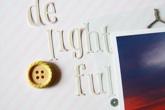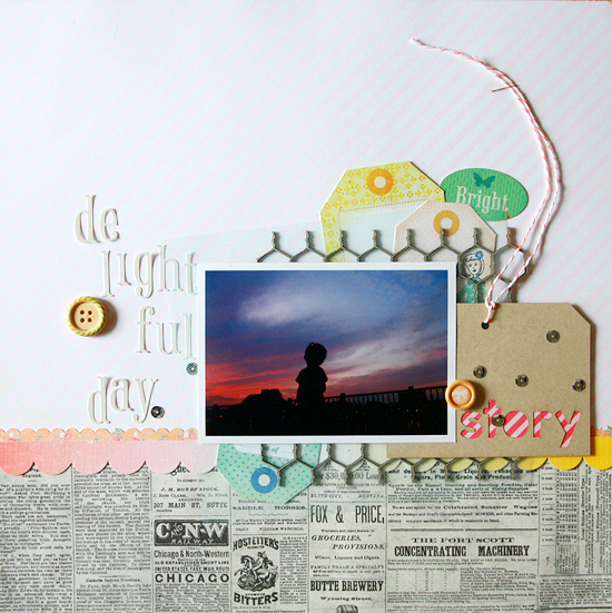 [12インチレイアウト「delightful day-story」] ピンクのストライプをベースに、暗めの写真を明るく飾れるレイアウトを作りました。 CratePaperのタグはカットアウトして数枚重ね、ちょうどチップボードから女の子がチラッと覗ける位置におきました。 写真を中心に色々と異素材なども重ねて奥行きを出し、他は空間を大事に作りました。 Lizzyのボタンは置くだけで存在感があります。 チップボードの上にチュールも重ねて異素材を組あわせました。
