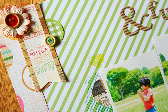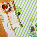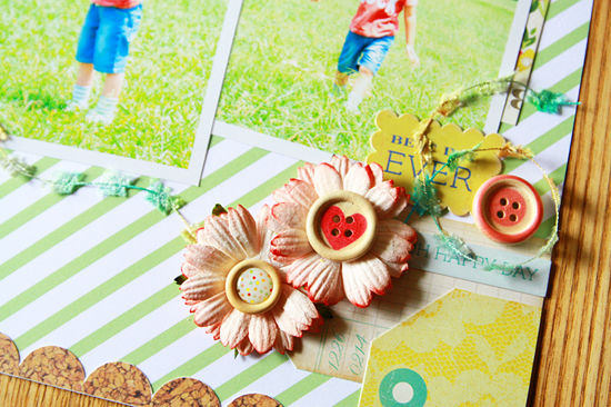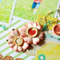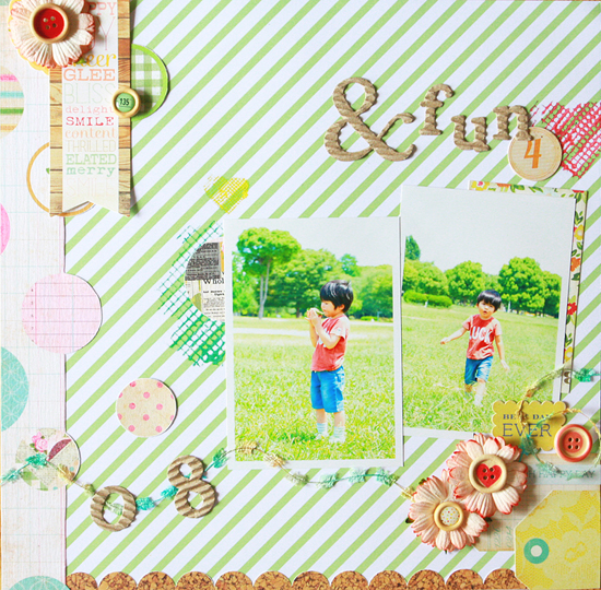 [12インチレイアウト「&fun 08」] 夏の写真を使って、爽やかで明るい作品を目指し作りました。 写真のバックにある緑と緑のストライプ台紙をシンクロさせて、写真を印象づけることが出来たと思います。 かわいらしいフラワーは、花芯をボタンに変えて存在感を増しました。 全体的にパステルカラーの中、RubOnやボタンの赤で濃いめの色を加えて夏っぽさを出した1枚です。