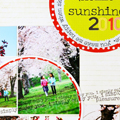 [12インチレイアウト「hello sunshine2010」] ペーパーを見た瞬間にすぐにイメージができたので、今年の桜の写真を使いました。 今回のキットの一番のツボはlilybeeのラブオンです。 まずフォントが好みだったのはもちろんなのですが、 サイズも大きいので12インチLOに使いやすいと思いました。 小さいスペースにぎゅっとつまっていてちまちま使う...という、 私のラブオンに対する勝手な負のイメージを払拭してくれた12インチサイズラブオン。 ラブオンは実はとっても苦手で、普段はあまり使いません。 私としては、これだけラブオン多用(他の方からするとそうでもなくても)のLOは初めてのことです。 私みたいにラブオンは苦手です、という方にぜひともお試しいただいて、 驚きを一緒に体感していただきたいです。 それに、パッケージも使わせてもらいました。 LO下方の12インチの長さの黒のボーダーがそうです。 他に使用のパッケージ類は、LO左中央部分のお花たち(BGクリップのパッケージ)や、 左下のボトルキャップとお花のボーダーの下(ボトルキャップのパッケージ)でした。