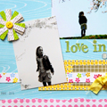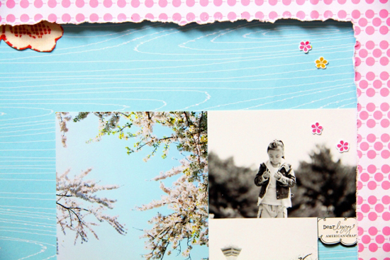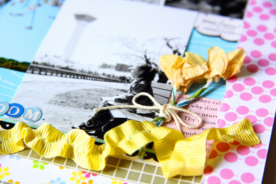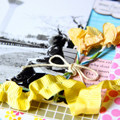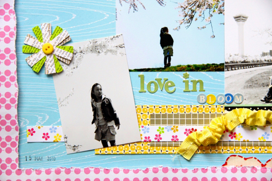 [12インチレイアウト「love in bloom」] 白のクレープペーパーをMayaMistのゴールドで着色、丸く切り抜いたものでお花の形をつくり、 麻ひもでリボンをつけて、小さな花束風にしてみました。(芯の部分もペーパーを細長く切ったものをくるくるねじっています) 外側のフレーム部分はテアリングして、ポップアップしてあります。 色(うすいブルーとピンク)がペーパーに似ている写真を1枚だけカラーのまま使用、それ以外はモノクロにしてあります。 リボンは糸をひっぱり、更にくしゅくしゅさせています。