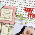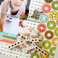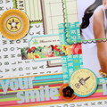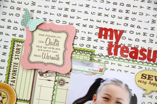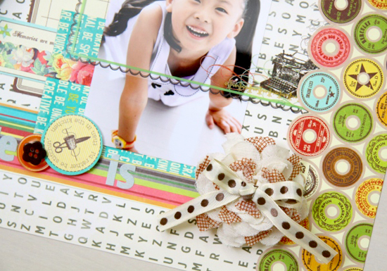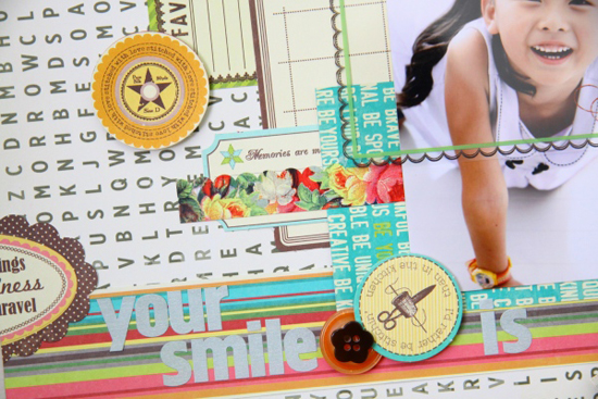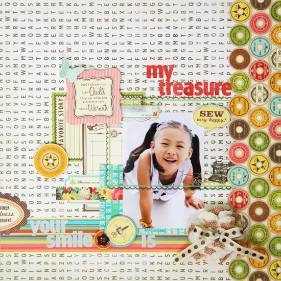 [12インチレイアウト「your smile is my treasure」] カードやダグ類をパズルをあわせるかのように配色で組み合わせて配置しました。 ペーパー類で色んな色を使っているので、写真は逆にうるさくならないように色味の少ないものをチョイス。 右下のお花はStudio CalicoのTissue Trimsをちぎってくしゃっとさせてから花びらにまぜています。 アルファベットステッカーが淡いブルーだったので、そのまま使ったり、赤のインクで着色してから使ったりしています。