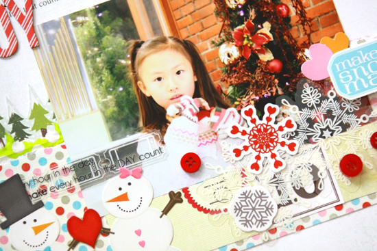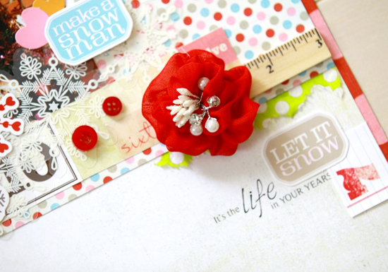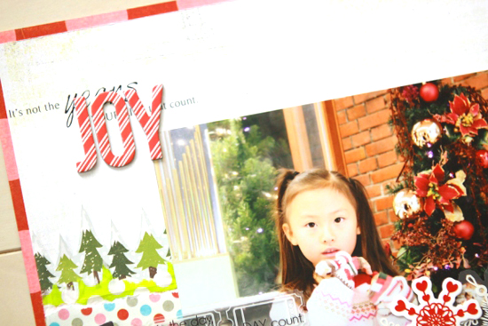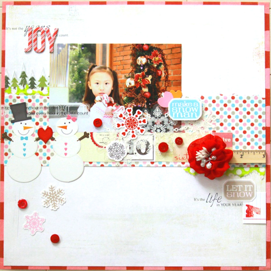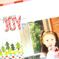 [12インチレイアウト「joy」] こちらは全体的に白と赤でまとめました。 雪の結晶のクリアなダイカットは、わざと何枚かを重ねて、クリアならではの質感を楽しみました。 クリアなので何枚重ねてもうるさくならず、そして下のペーパーをほどよくぼかしてくれ、 やさしい感じに仕上げてくれる効果があると思います。 同じくクリアなチケットのほうは、上からラブオンを使ってみました。 水玉のペーパーはテアリング(紙を破る)をしていています。
