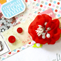 こちらは全体的に白と赤でまとめました。 雪の結晶のクリアなダイカットは、わざと何枚かを重ねて、クリアならではの質感を楽しみました。 クリアなので何枚重ねてもうるさくならず、そして下のペーパーをほどよくぼかしてくれ、 やさしい感じに仕上げてくれる効果があると思います。 同じくクリアなチケットのほうは、上からラブオンを使ってみました。 水玉のペーパーはテアリング(紙を破る)をしていています。
